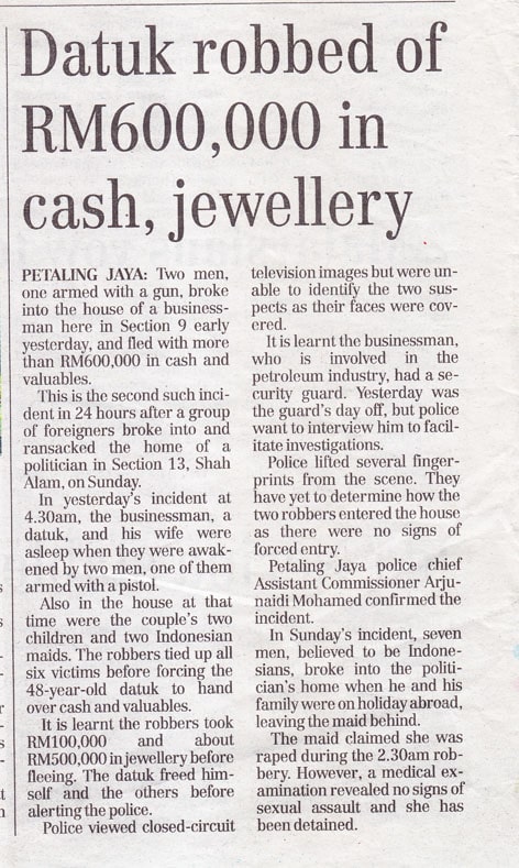 Wang tunai dan barang kemas Datuk dirompak